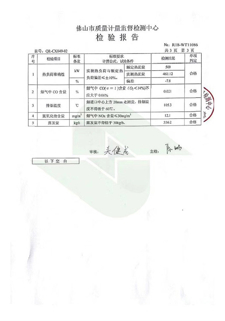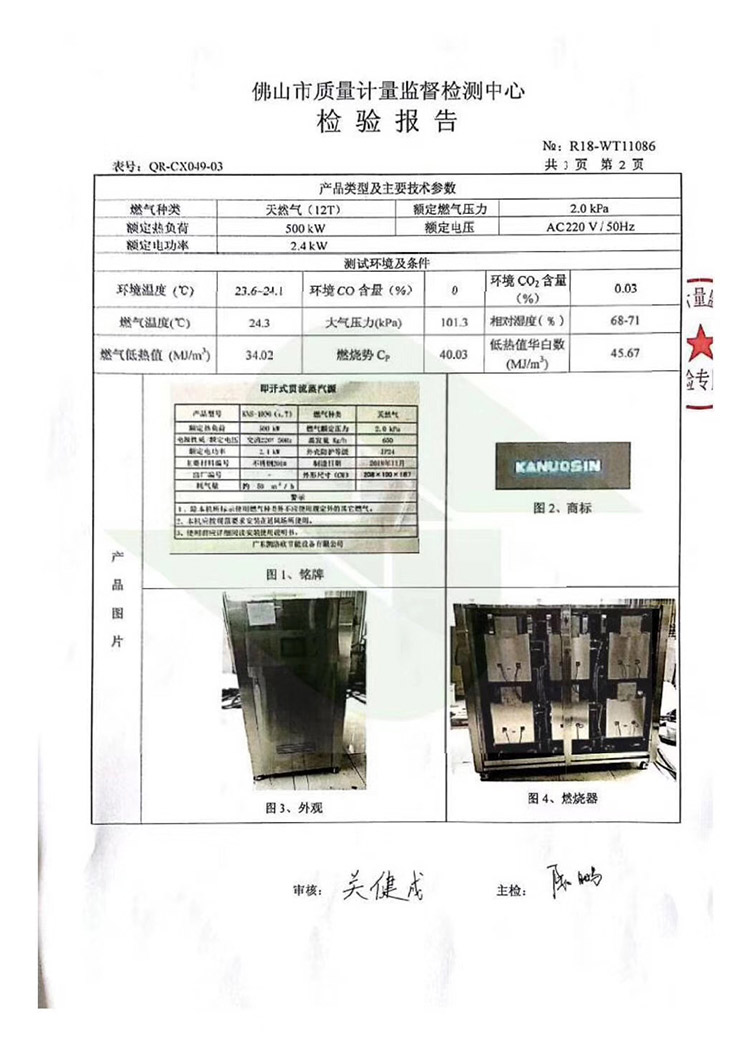 一周前,我司委托第三方国家燃气用具产品质量监督检验中心(佛山)对我司生产的低氮蒸汽锅炉“即开式贯流蒸汽源”进行排放物氮氧化物、二氧化硫的检测。在检测中,凯洛欣低氮蒸汽锅炉氮氧化物(NOx)的实测值为:12.1mg/m3。