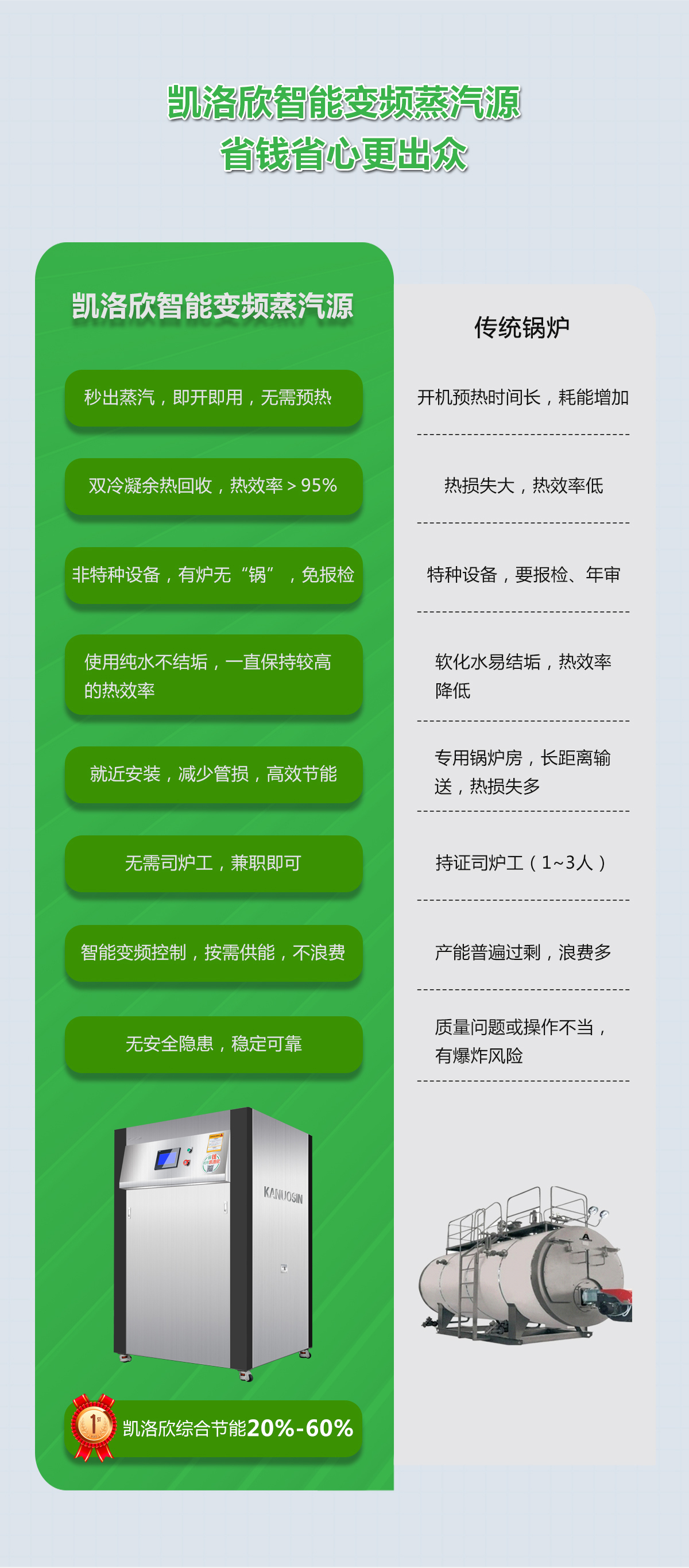 ★凯洛欣智能变频蒸汽源,通过内置汽水分离器,把高温热水分离出来,炉内即刻循环再利用,重复不浪费,节能性能更优!